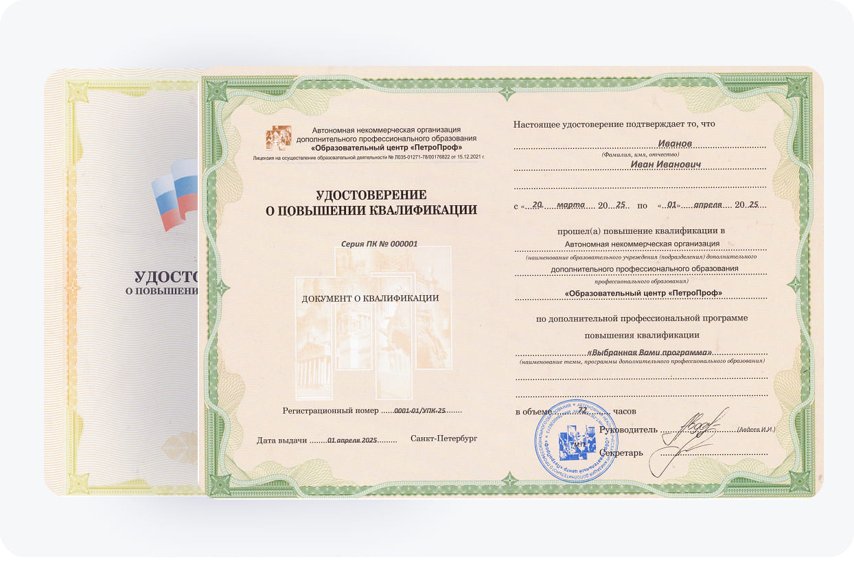 По завершении курса профобразования слушатели получают удостоверение о повышении квалификации (УПК), подтверждающее присвоенные компетенции и дающее право заниматься профессиональной деятельностью в данной сфере. Учебный центр «ПетроПроф» обладает всеми необходимыми лицензиями и аккредитациями, гарантирующими легитимность выданных документов и признание их работодателями.